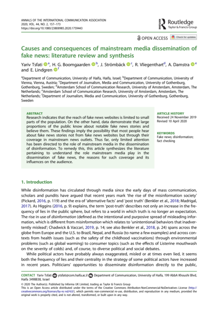 "Research indicates that the reach of fake news websites is limited to small parts of the population. On the other hand, data demonstrate that large proportions of the public know about notable fake news stories and believe them. These findings imply the possibility that most people hear about fake news stories not from fake news websites but through their coverage in mainstream news outlets. Thus far, only limited attention has been directed to the role of mainstream media in the dissemination of disinformation. To remedy this, this article synthesizes the literature pertaining to understand the role mainstream media play in the dissemination of fake news, the reasons for such coverage and its influences on the audience." (Abstract)