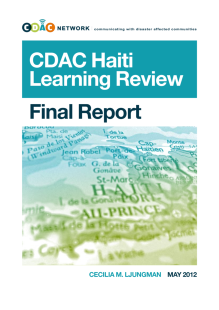 "In the immediate aftermath of the January 2010 earthquake in Haiti, the CDAC (Communicating with Disaster Affected Communities) Network undertook its first ever ground initiative. This initiative, which came to be known as CDAC Haiti, was funded largely through the OCHA’s ERRF with some additional short-term funding in 2011 from the global CDAC Network and the World Health Organisation (WHO). In total, CDAC Haiti received US $615,000. This Learning Review aims to document CDAC Haiti’s activities, assess achievements, and contribute knowledge about what worked, what didn’t, and why. A key component of the Review is the identification of lessons from this ‘new’ area of humanitarian coordination that can be drawn for other emergency operations." (Page iv)