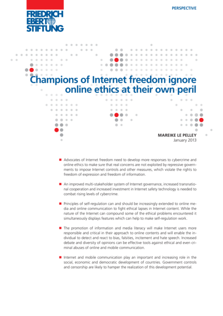 "Advocates of Internet freedom need to develop more responses to cybercrime and online ethics to make sure that real concerns are not exploited by repressive governments to impose Internet controls and other measures, which violate the rights to freedom of expression and freedom of information. An improved multi-stakeholder system of Internet governance, increased transnational cooperation and increased investment in Internet safety technology is needed to combat rising levels of cybercrime. Principles of self-regulation can and should be increasingly extended to online media and online communication to fight ethical lapses in Internet content. While the nature of the Internet can compound some of the ethical problems encountered it simultaneously displays features which can help to make self-regulation work." (Page 1)