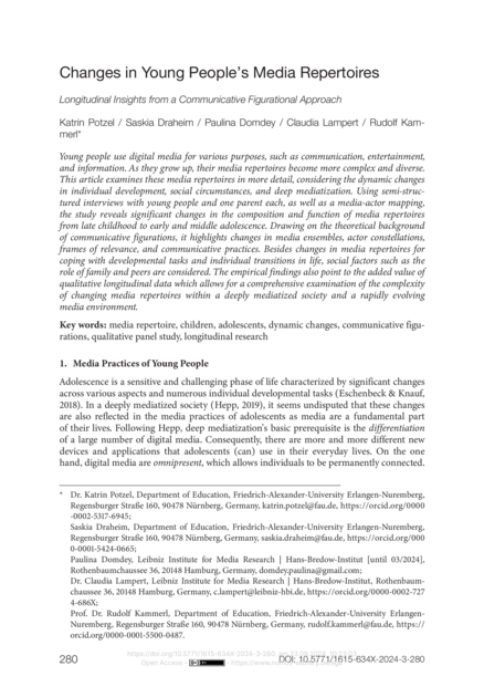 "Young people use digital media for various purposes, such as communication, entertainment, and information. As they grow up, their media repertoires become more complex and diverse. This article examines these media repertoires in more detail, considering the dynamic changes in individual development, social circumstances, and deep mediatization. Using semi-structured interviews with young people and one parent each, as well as a media-actor mapping, the study reveals significant changes in the composition and function of media repertoires from late childhood to early and middle adolescence. Drawing on the theoretical background of communicative figurations, it highlights changes in media ensembles, actor constellations, frames of relevance, and communicative practices. Besides changes in media repertoires for coping with developmental tasks and individual transitions in life, social factors such as the role of family and peers are considered. The empirical findings also point to the added value of qualitative longitudinal data which allows for a comprehensive examination of the complexity of changing media repertoires within a deeply mediatized society and a rapidly evolving media environment." (Abstract)