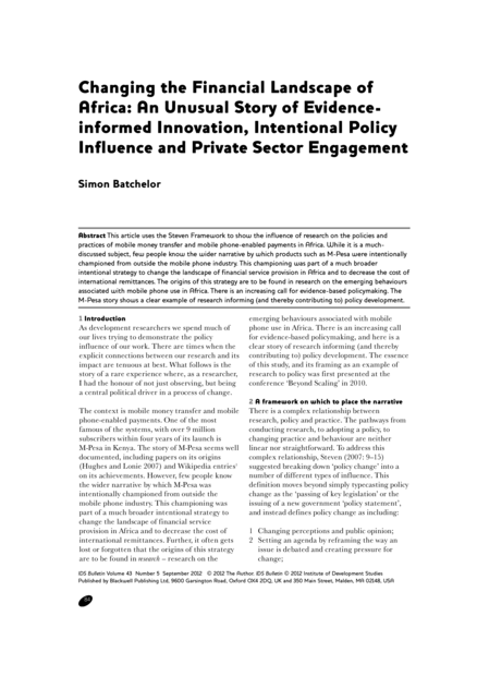"This article uses the Steven Framework to show the influence of research on the policies and practices of mobile money transfer and mobile phone-enabled payments in Africa. While it is a muchdiscussed subject, few people know the wider narrative by which products such as M-Pesa were intentionally championed from outside the mobile phone industry. This championing was part of a much broader intentional strategy to change the landscape of financial service provision in Africa and to decrease the cost of international remittances. The origins of this strategy are to be found in research on the emerging behaviours associated with mobile phone use in Africa. There is an increasing call for evidence-based policymaking. The M-Pesa story shows a clear example of research informing (and thereby contributing to) policy development." (Abstract)