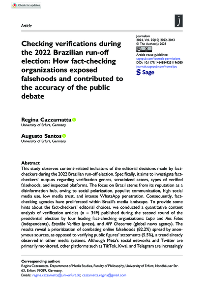 "This study observes content-related indicators of the editorial decisions made by factcheckers during the 2022 Brazilian run-off election. Specifically, it aims to investigate factcheckers’ outputs regarding verification genres, scrutinized actors, types of verified falsehoods, and inspected platforms. The focus on Brazil stems from its reputation as a disinformation hub, owing to social polarization, populist communication, high social media use, low media trust, and intense WhatsApp penetration. Consequently, factchecking agencies have proliferated within Brazil’s media landscape. To provide some hints about the fact-checkers’ editorial choices, we conducted a quantitative content analysis of verification articles (n = 349) published during the second round of the presidential election by four leading fact-checking organizations: Lupa and Aos Fatos (independents), Estadão Verifica (press), and AFP Checamos (global news agency). The results reveal a prioritization of combating online falsehoods (82.2%) spread by anonymous sources, as opposed to verifying public figures’ statements (5.5%), a trend already observed in other media systems. Although Meta’s social networks and Twitter are primarily monitored, other platforms such as TikTok, Kwai, and Telegram are increasingly gaining fact-checkers’ attention. Fact-checkers predominantly scrutinized anonymous disinformation agents. Moreover, they primarily debunked falsehoods targeting the opposition, legacy media, social networking companies, and the Supreme Electoral Court. Despite the anonymity, 77.4% of the verified falsehoods were found to be beneficial to Bolsonaro, while 12% were advantageous to Lula da Silva." (Abstract)