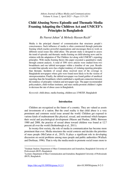 "The present study is designed to assess the trend of episodic and thematic media framing on child-abusing news and its relation with the adaptation of The Children Act along with UNICEF's reporting principles. With media framing theory this paper executed a quantitative study through content analysis. A total of 1091 news articles were studied from two broadsheets and one tabloid newspaper within a timeline of one year. Results revealed that episodic news has a higher tendency of violating reporting principles than thematic. Incidents of sexual abuse received most of the coverage in Bangladeshi newspapers where girls were found most likely to be the victims of misrepresentation. Finally, the tabloid newspaper was found guiltier of unethical reporting than the broadsheets which established a significant connection between the tendency of principles violation and newspaper type. The paper recommended policymakers, child welfare institutes, and mass media promote children's rights to decrease the rate of abuse cases in Bangladesh." (Abstract)