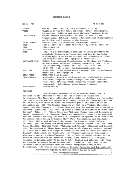 "The 2000 Yearbook treats two themes, both of which relate to newer features of the media landscape: violence in video and computer games, and pornography on television and on Internet. Some articles in the Yearbook also discuss findings on audience perceptions of violence and sex in the media. The choice of these themes has to do with the marked increase in the availability of such content to children and youth via new media technologies. The Yearbook comes with two bibliographies: Research on Pornography and Sex in the Media and Research on Video and Computer Games." (Publisher description)