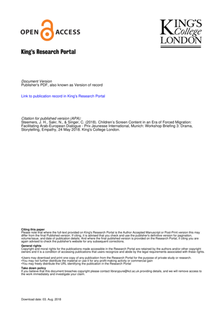 Children’s Screen Content in an Era of Forced Migration: Facilitating Arab-European Dialogue. Prix Jeunesse International, Munich. Workshop Briefing 3: Drama, Storytelling, Empathy