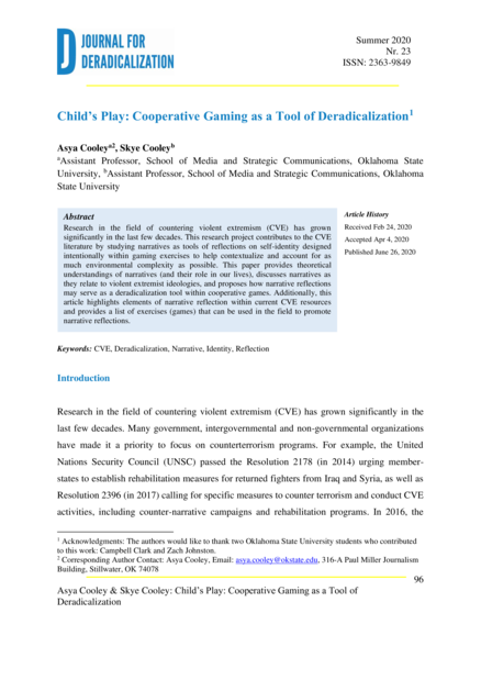 "This research project contributes to the CVE (countering violent extremism) literature by studying narratives as tools of reflections on self-identity designed intentionally within gaming exercises to help contextualize and account for as much environmental complexity as possible. This paper provides theoretical understandings of narratives (and their role in our lives), discusses narratives as they relate to violent extremist ideologies, and proposes how narrative reflections may serve as a deradicalization tool within cooperative games. Additionally, this article highlights elements of narrative reflection within current CVE resources and provides a list of exercises (games) that can be used in the field to promote narrative reflections." (Abstract)