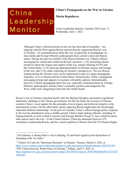 "Although China's official position on the war has been that of neutrality-not aligning with the West against Russia and not directly supporting Russia's war in Ukraine-its communications about the war, in particular its propaganda via state media and Foreign Ministry spokespeople have carried a more pro-Russia stance. During the past two months of the Russia-Ukraine war, Chinese official messaging has echoed and reinforced Russia's position: 1.) by promoting shared narratives about the origins and culprits of the war, namely blaming NATO and the United States; 2.) by drawing disproportionally on Russian sources and footage of the war; and 3.) by under-reporting on Ukraine's perspectives. This pro-Russia leaning during the Ukraine crisis can be understood as part of a larger propaganda trajectory vis-à-vis Russia and the United States. Domestically, China's propaganda messaging in large part appears to resonate with public opinion. Internationally, however, Chinese propaganda about the war, especially communications by Foreign Ministry spokespeople, delude China's neutrality position and antagonize the West, while more integrating China into the Global South." (Page 1)