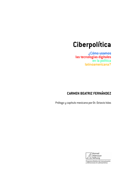 "[...] ¿En qué medida [los polÃticos] saben aprovechar de la mejor manera del ciberactivismo, sobre todo durante las campañas electorales? ¿Qué espacio queda desaprovechado y dónde se hacen usos contrarios a las exigencias democráticas? El Programa Medios de Comunicación y Democracia en Latinoamérica de la Fundación Konrad Adenauer consideró importante analizar estos aspectos. Por eso se financió un primer análisis latinoamericano. El trabajo siguió la idea de la autora, Carmen Beatriz Fernández, quien es conocida dentro de la red OCPLA de consultores polÃticos en la subregión como experta en esta área. En esta publicación se aclaran aspectos adicionales en varios capÃtulos, que apuntan a hacer conocer no sólo las mejores prácticas sino también las trampas, los fundamentos básicos para la organización de la ciberpolÃtica y cómo resolver la paradoja de ser masivo y a la vez personal." (Presentación, página 7-8)