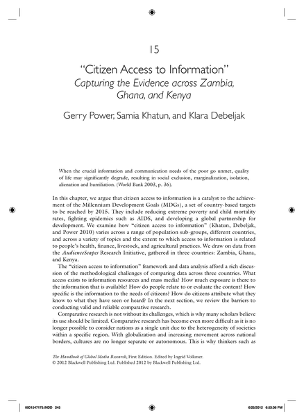 "In this chapter, we argue that citizen access to information is a catalyst to the achievement of the Millenium Development Goals (MDGs) [...] We examine how citizen access to information varies across a range of population sub-groups, different countries, and across a variety of topics and the extent to which access to information is related to people's health, finance, livestock, and agricultural practices. We draw on data from the AudienceScapes Research Initiative, gathered in three countries. Zambia, Ghana, and Kenya." (Page 245)