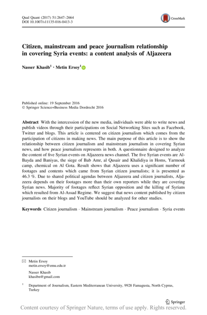 "With the intercession of the new media, individuals were able to write news and publish videos through their participations on Social Networking Sites such as Facebook, Twitter and blogs. This article is centered on citizen journalism which comes from the participation of citizens in making news. The main purpose of this article is to show the relationship between citizen journalism and mainstream journalism in covering Syrian news, and how peace journalism represents in both. A questionnaire designed to analyze the content of five Syrian events on Aljazeera news channel. The five Syrian events are Al- Bayda and Baniyas, the siege of Bab Amr, al Qusair and Khalidiya in Homs, Yarmouk camp, chemical on Al Gota. Result shows that Aljazeera uses a significant number of footages and contents which came from Syrian citizen journalists; it is presented as 46.3 %. Due to shared political agendas between Aljazeera and citizen journalists, Aljazeera depends on their footages more than their own reporters while they are covering Syrian news. Majority of footages reflect Syrian opposition and the killing of Syrians which resulted from Al-Assad Regime. We suggest that news content published by citizen journalists on their blogs and YouTube should be analyzed for other studies." (Abstract)