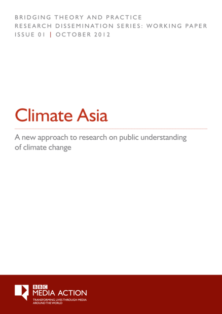 "Climate Asia will be the largest ever research study into public understanding of climate change in Asia with more than 33,000 interviews conducted across seven countries: Bangladesh, China, India, Indonesia, Nepal, Pakistan and Vietnam. This working paper explains the distinctive research approach BBC Media Action has taken in these seven focus countries, which have a combined population of more than three billion people. Utilising a multi-country, multi-method replicable research design, BBC Media Action aims to provide an evidence base for public understanding of climate change in Asia. BBC Media Action has taken a standard approach to research across all seven countries to enable the exploration and analysis of similarities and differences across and within these countries. Drawing insights from literature, qualitative research and a series of communications strategy development workshops, BBC Media Action’s research examines people’s understanding of the effects and impacts of climate change and their responses. This approach differs markedly from much existing research in that it does not focus primarily on the concept of climate change. Instead, BBC Media Action used insights from formative work to ask people questions using language and concepts that are more likely to relate to their day-to-day lives. Questions in the Climate Asia survey focus on tangible issues including food, water, energy and extreme weather events. This research is designed to inform the development of communications strategies that support and enable responses to impacts associated with climate change." (Executive summary)