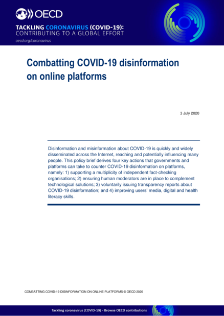 "Disinformation and misinformation about COVID-19 is quickly and widely disseminated across the Internet, reaching and potentially influencing many people. This policy brief derives four key actions that governments and platforms can take to counter COVID-19 disinformation on platforms, namely: 1) supporting a multiplicity of independent fact-checking organisations; 2) ensuring human moderators are in place to complement technological solutions; 3) voluntarily issuing transparency reports about COVID-19 disinformation; and 4) improving users’ media, digital and health literacy skills." (Page 1)