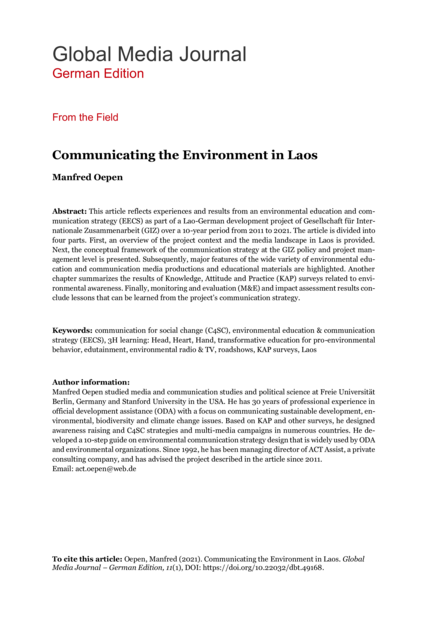 "This article reflects experiences and results from an environmental education and communication strategy (EECS) as part of a Lao-German development project of Gesellschaft für Internationale Zusammenarbeit (GIZ) over a 10-year period from 2011 to 2021. The article is divided into four parts. First, an overview of the project context and the media landscape in Laos is provided. Next, the conceptual framework of the communication strategy at the GIZ policy and project management level is presented. Subsequently, major features of the wide variety of environmental education and communication media productions and educational materials are highlighted. Another chapter summarizes the results of Knowledge, Attitude and Practice (KAP) surveys related to environmental awareness. Finally, monitoring and evaluation (M&E) and impact assessment results conclude lessons that can be learned from the project’s communication strategy." (Abstract)