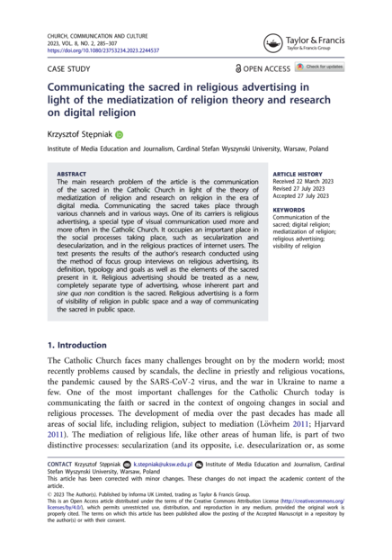 "The main research problem of the article is the communication of the sacred in the Catholic Church in light of the theory of mediatization of religion and research on religion in the era of digital media. Communicating the sacred takes place through various channels and in various ways. One of its carriers is religious advertising, a special type of visual communication used more and more often in the Catholic Church. It occupies an important place in the social processes taking place, such as secularization and desecularization, and in the religious practices of internet users. The text presents the results of the author’s research conducted using the method of focus group interviews on religious advertising, its definition, typology and goals as well as the elements of the sacred present in it. Religious advertising should be treated as a new, completely separate type of advertising, whose inherent part and sine qua non condition is the sacred. Religious advertising is a form of visibility of religion in public space and a way of communicating the sacred in public space." (Abstract)