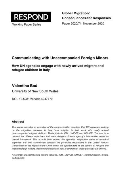 "This paper provides an overview of the communication practices that UN agencies working on the migration response in Italy have adopted in their work with newly arrived unaccompanied migrant children. These include IOM, UNICEF and UNHCR. The aim is to present the different objectives and methodologies of each agency s intervention under an overall framework. This is built both around the agencies respective areas of technical expertise and their commitment towards the principles expounded in the United Nations Convention on the Rights of the Child, which are applied here in the context of refugee and migrant foreign minors. Recommendations on how to strengthen these practices are offered." (Abstract)