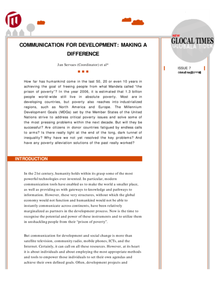 "In the year 2006, it is estimated that 1.3 billion people world-wide still live in absolute poverty. Most are in developing countries, but poverty also reaches into industrialized regions, such as North America and Europe. The Millennium Development Goals (MDGs) set by the Member States of the United Nations strive to address critical poverty issues and solve some of the most pressing problems within the next decade. But will they be successful? Are citizens in donor countries fatigued by endless calls to arms? Is there really light at the end of the long, dark tunnel of inequality? Why have we not yet resolved the key problems? And have any poverty alleviation solutions of the past really worked?" (Page 1)