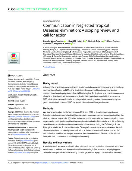 "To understand how communication action is conceived and practiced, we conducted a scoping review with a focus on two diseases currently targeted for elimination: lymphatic filariasis (LF) and Chagas disease (CD). We examined 43 studies published between 2012 and 2020 to identify communication practices, theoretical frameworks informing communication action and levels of intended influence. Community participation was the goal most commonly pursued through communication action, both in LF and CD strategies; important attempts at expanding the scope and reach of this practice were identified. However, our results indicate that while the field of health communication has gained complexity in the understanding of the nature of communication ecologies in public health interventions, neglected tropical diseases (NTD) research has maintained a superficial involvement with health communication theory and science. This article is a call to action to consider the resources offered by the health communication field when researching, designing, or implementing NTD interventions to enhance the possibilities of communication action in implementation settings." (Author summary)