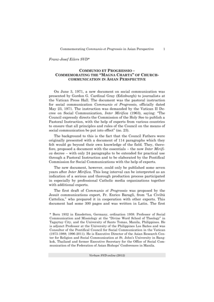 Communio et Progressio: Commemorating the "Magna Charta" of Church Communication in Asian Perspective