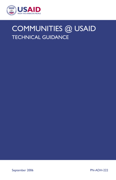 "Communities of practice (CoPs) provide people with a desire to address, discuss, and share their knowledge on a particular topic or issue with the means to do so. The USAID Knowledge for Development Strategy identifies such communities as vital to allowing USAID to reach its full knowledge-sharing capacity and improve its business process. We recognize that creating and maintaining a community requires dedication and direction. USAID’s 'Communities@USAID Technical Guidance' was developed to assist in this process. Designed to be an easy “how to” manual for those launching and sustaining a community, the guidance steps you through the process from beginning to end." (Preface)