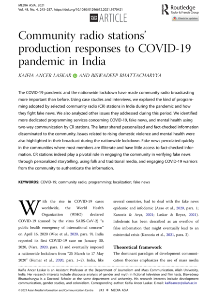 "The COVID-19 pandemic and the nationwide lockdown have made community radio broadcasting more important than before. Using case studies and interviews, we explored the kind of programming adopted by selected community radio (CR) stations in India during the pandemic and how they fight fake news. We also analyzed other issues they addressed during this period. We identified more dedicated programming services concerning COVID-19, fake news, and mental health using two-way communication by CR stations. The latter shared personalized and fact-checked information disseminated to the community. Issues related to rising domestic violence and mental health were also highlighted in their broadcast during the nationwide lockdown. Fake news percolated quickly in the communities where most members are illiterate and have little access to fact-checked information. CR stations indeed play a pivotal role in engaging the community in verifying fake news through personalized storytelling, using folk and traditional media, and engaging COVID-19 warriors from the community to authenticate the information." (Abstract)
