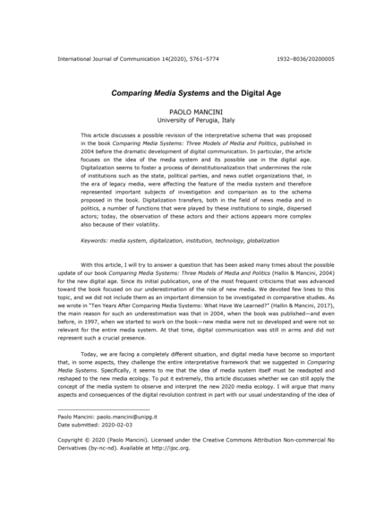 "This article discusses a possible revision of the interpretative schema that was proposed in the book Comparing Media Systems: Three Models of Media and Politics, published in 2004 before the dramatic development of digital communication. In particular, the article focuses on the idea of the media system and its possible use in the digital age. Digitalization seems to foster a process of deinstitutionalization that undermines the role of institutions such as the state, political parties, and news outlet organizations that, in the era of legacy media, were affecting the feature of the media system and therefore represented important subjects of investigation and comparison as to the schema proposed in the book. Digitalization transfers, both in the field of news media and in politics, a number of functions that were played by these institutions to single, dispersed actors; today, the observation of these actors and their actions appears more complex also because of their volatility." (Abstract)