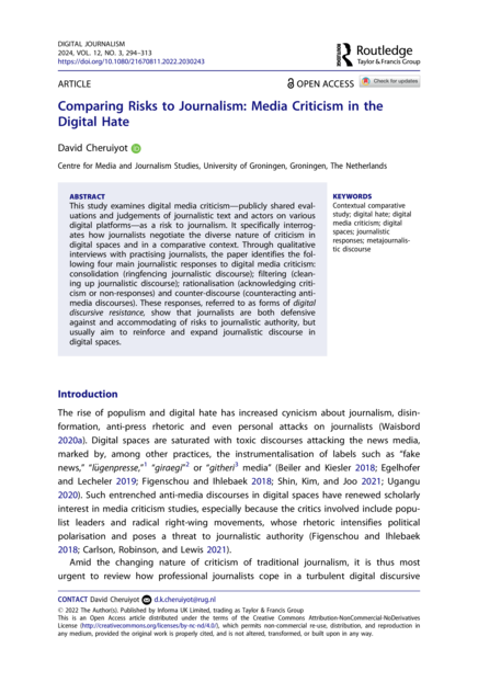 "This study examines digital media criticism—publicly shared evaluations and judgements of journalistic text and actors on various digital platforms—as a risk to journalism. It specifically interrogates how journalists negotiate the diverse nature of criticism in digital spaces and in a comparative context. Through qualitative interviews with practising journalists, the paper identifies the following four main journalistic responses to digital media criticism: consolidation (ringfencing journalistic discourse); filtering (cleaning up journalistic discourse); rationalisation (acknowledging criticism or non-responses) and counter-discourse (counteracting anti-media discourses). These responses, referred to as forms of digital discursive resistance, show that journalists are both defensive against and accommodating of risks to journalistic authority, but usually aim to reinforce and expand journalistic discourse in digital spaces." (Abstract)