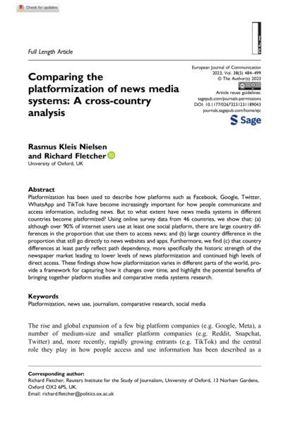 "Platformization has been used to describe how platforms such as Facebook, Google, Twitter, WhatsApp and TikTok have become increasingly important for how people communicate and access information, including news. But to what extent have news media systems in different countries become platformized? Using online survey data from 46 countries, we show that: (a) although over 90% of internet users use at least one social platform, there are large country differences in the proportion that use them to access news; and (b) large country difference in the proportion that still go directly to news websites and apps. Furthermore, we find (c) that country differences at least partly reflect path dependency, more specifically the historic strength of the newspaper market leading to lower levels of news platformization and continued high levels of direct access. These findings show how platformization varies in different parts of the world, provide a framework for capturing how it changes over time, and highlight the potential benefits of bringing together platform studies and comparative media systems research." (Abstract)