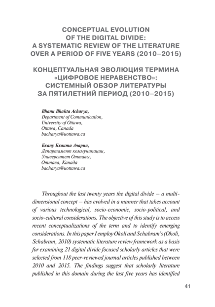 "Throughout the last twenty years the digital divide – a multidimensional concept – has evolved in a manner that takes account of various technological, socio-economic, socio-political, and socio-cultural considerations. The objective of this study is to access recent conceptualizations of the term and to identify emerging considerations. In this paper I employ Okoli and Schabram’s (Okoli, Schabram, 2010) systematic literature review framework as a basis for examining 21 digital divide focused scholarly articles that were selected from 118 peer-reviewed journal articles published between 2010 and 2015. The findings suggest that scholarly literature published in this domain during the last five years has identified 42 user attitudes towards technology, motivations for use of technology, and socio-cultural backgrounds as factors influencing the notion of the digital divide. Despite the lack of a widely agreed upon definition of the digital divide, recent conceptualizations appear to be moving away from the traditional emphasis on technological and economic gaps. The central theme of the selected articles is that without addressing long existing socio-economic and sociocultural inequalities, which are real and deep divides, bridging the technological gaps might not end the real issue of digital divide."