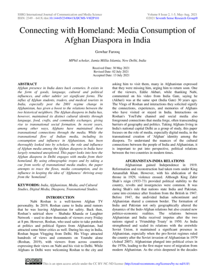 "Afghan presence in India dates back centuries. It exists in the form of goods, language, cultural and political influences, and other subtler yet significant forms. The influx of Afghan students, traders, and medical tourists in India, especially post the 2001 regime change in Afghanistan, has given a boost to the relations between the two historical neighbors. The Afghan diaspora in India has, however, maintained its distinct cultural identity through language, food, crafts, and commodity exchanges, giving rise to transnational social formation. In recent years, among other ways, Afghans have maintained these transnational connections through the media. While the transnational flow of Indian media, including its consumption and influence in Afghanistan, has been thoroughly looked into by scholars, the role and influence of Afghan media among the Afghan diaspora in India have largely remained unexplored. This paper looks into how the Afghan diaspora in Delhi engages with media from their homeland. By using ethnographic tropes and by taking a cue from works of transnational media studies, the paper attempts to trace the flows, media consumption, and its influence in keeping the idea of ‘Afghaness’ thriving away from the ‘homeland’." (Abstract)