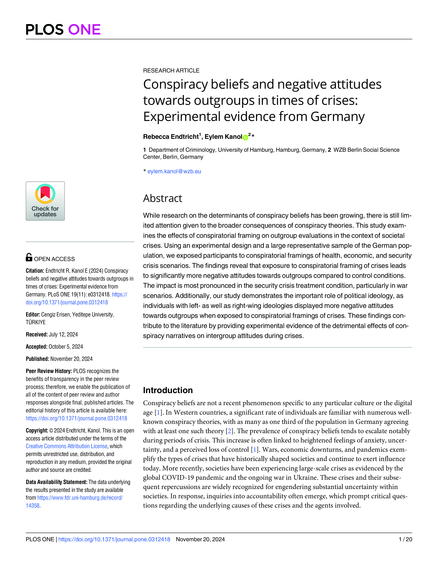 "While research on the determinants of conspiracy beliefs has been growing, there is still limited attention given to the broader consequences of conspiracy theories. This study examines the effects of conspiratorial framing on outgroup evaluations in the context of societal crises. Using an experimental design and a large representative sample of the German population, we exposed participants to conspiratorial framings of health, economic, and security crisis scenarios. The findings reveal that exposure to conspiratorial framing of crises leads to significantly more negative attitudes towards outgroups compared to control conditions. The impact is most pronounced in the security crisis treatment condition, particularly in war scenarios. Additionally, our study demonstrates the important role of political ideology, as individuals with left- as well as right-wing ideologies displayed more negative attitudes towards outgroups when exposed to conspiratorial framings of crises. These findings contribute to the literature by providing experimental evidence of the detrimental effects of conspiracy narratives on intergroup attitudes during crises." (Abstract)