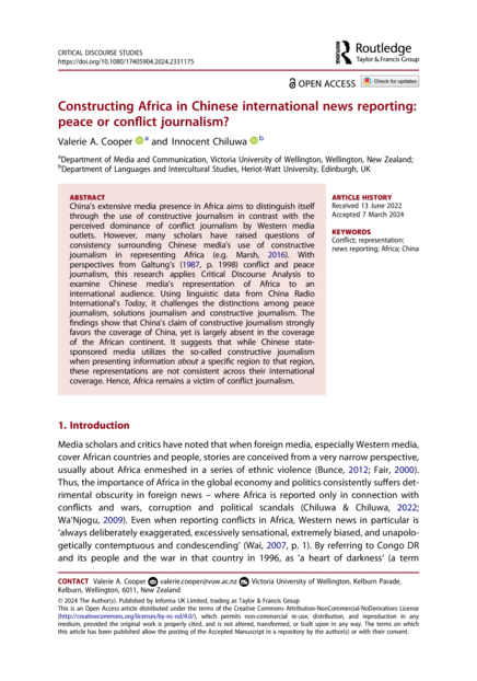 "China’s extensive media presence in Africa aims to distinguish itself through the use of constructive journalism in contrast with the perceived dominance of conflict journalism by Western media outlets. However, many scholars have raised questions of consistency surrounding Chinese media’s use of constructive journalism in representing Africa (e.g. Marsh, 2016). With perspectives from Galtung’s (1987, p. 1998) conflict and peace journalism, this research applies Critical Discourse Analysis to examine Chinese media’s representation of Africa to an international audience. Using linguistic data from China Radio International’s Today, it challenges the distinctions among peace journalism, solutions journalism and constructive journalism. The findings show that China’s claim of constructive journalism strongly favors the coverage of China, yet is largely absent in the coverage of the African continent. It suggests that while Chinese state-sponsored media utilizes the so-called constructive journalism when presenting information about a specific region to that region, these representations are not consistent across their international coverage. Hence, Africa remains a victim of conflict journalism." (Abstract)