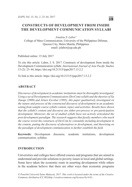 "Discourses of development in academic institutions must be thoroughly investigated. Using a set of Development Communication (DevCom) syllabi and the theories of Xu Xiaoge (2009) and Arturo Escobar (1995), this paper qualitatively investigated on the nature and process of the constructed discourse of development in an academic setting from sample course syllabi content, topics and activities. Results have shown that the syllabi's content and discourse are either pro-process or pro-participation development. Moreover, the set of studied syllabi have not actively articulated the post-development paradigm. The research suggests that faculty members who teach the course revisit the constructs of DevCom by constantly including development in the content, putting the discourse of alternatives to development, and theorising on the paradigm of development communication to further establish the field." (Abstract)