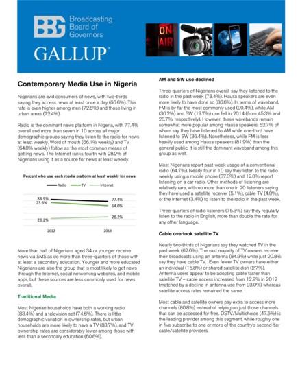 "While radio is still in the lead for news consumption in Nigeria, the use of digital media and mobile continues to grow rapidly. The new research also reveals that Nigerian personal mobile phone ownership has increased significantly in 2014 to 83.0%, up from 73.1% in 2012. Mobile web is the leading means of accessing the Internet with 95.7% of those who accessed the Internet in the past week saying they did so using a mobile phone." (BBG website)