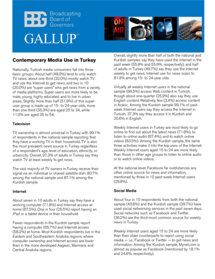 "Nationally, Turkish media consumers fall into three basic groups: About half (48.0%) tend to only watch TV news; about one-third (32.0%) mostly watch TV and use the Internet to get news, and two in 10 (20.0%) are “super users” who get news from a variety of media platforms. Super-users are more likely to be male, young, highly educated, and to live in urban areas." (Page 1)