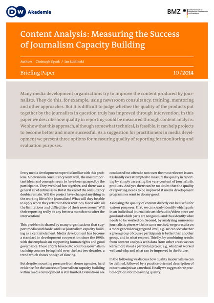 "In this paper we describe how quality in reporting could be measured through content analysis. We show that this approach, although somewhat technical, is feasible. It can help projects to become better and more successful. As a suggestion for practitioners in media development we present three options for measuring quality of reporting for monitoring and evaluation purposes." (Abstract)