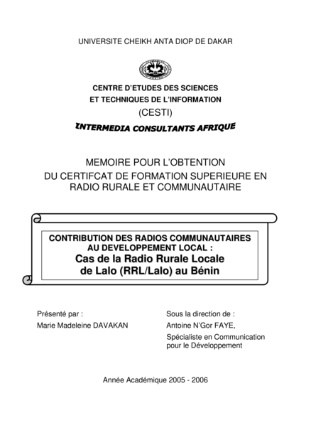 Dakar: Centre d'Etudes des Sciences et Techniques de l'Information (CESTI) Université Cheihk Anta Diop (2006), 19 pp., 84 pp.