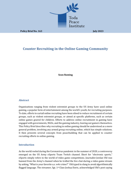 "Organisations ranging from violent extremist groups to the US Army have used online gaming, a popular form of entertainment among the world’s youth, for recruiting purposes. To date, efforts to curtail online recruiting have been siloed to reduce recruitment of certain groups, such as violent extremist groups, or aimed at specific platforms, such as certain online games geared for children. Efforts to address online recruitment in gaming have engaged with governments, NGOs, and the gaming industry, leaving out gamers themselves. This Policy Brief describes why recruiting in online gaming should be understood as a more general problem, involving any armed group recruiting online, which has simple solutions. It then presents several concepts from peacebuilding that can be applied to counter recruiting efforts in online gaming." (Abstract)