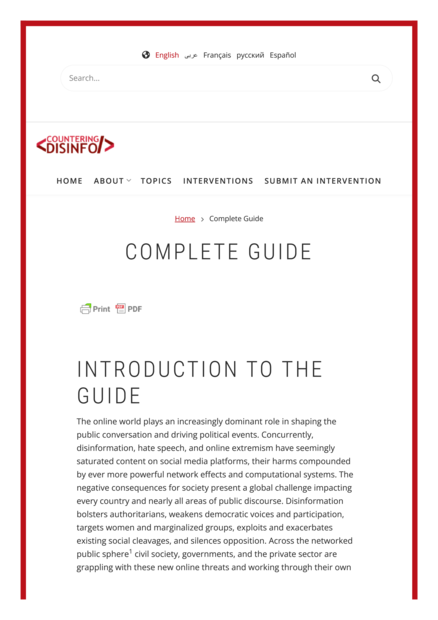"This resource combines the collective wisdom of organizations on the front lines of combatting disinformation globally. This living project provides an outline of what’s being done to address the challenge in key areas and provides a searchable database of the organizations around the world engaged in making the digital landscape safe for democracy. Effective democracies require that citizens have access to accurate and impartial electoral and political information. Disinformation campaigns spread cynicism, distort political processes and hinder citizens’ ability to make sound political decisions. Together we seek to identify what works, and expand the community engaged in this effort." (Publisher description)