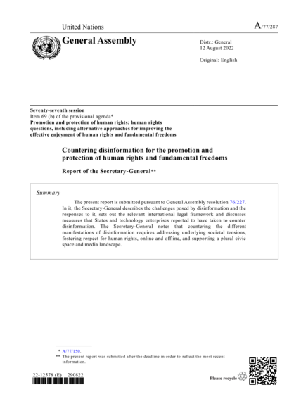 "The present report is submitted pursuant to General Assembly resolution 76/227. In it, the Secretary-General describes the challenges posed by disinformation and the responses to it, sets out the relevant international legal framework and discusses measures that States and technology enterprises reported to have taken to counter disinformation. The Secretary-General notes that countering the different manifestations of disinformation requires addressing underlying societal tensions, fostering respect for human rights, online and offline, and supporting a plural civic space and media landscape." (Summary)