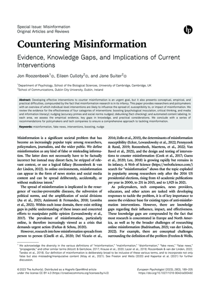 "This paper provides researchers and policymakers with an overview of which individual-level interventions are likely to influence the spread of, susceptibility to, or impact of misinformation. We review the evidence for the effectiveness of four categories of interventions: boosting (psychological inoculation, critical thinking, and media and information literacy); nudging (accuracy primes and social norms nudges); debunking (fact-checking); and automated content labeling. In each area, we assess the empirical evidence, key gaps in knowledge, and practical considerations. We conclude with a series of recommendations for policymakers and tech companies to ensure a comprehensive approach to tackling misinformation." (Abstract)