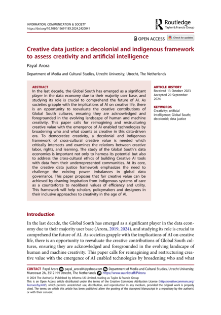 "In the last decade, the Global South has emerged as a significant player in the data economy due to their majority user base, and studying its role is crucial to comprehend the future of AI. As societies grapple with the implications of AI on creative life, there is an opportunity to reevaluate the creative contributions of Global South cultures, ensuring they are acknowledged and foregrounded in the evolving landscape of human and machine creativity. This paper calls for reimagining and restructuring creative value with the emergence of AI enabled technologies by broadening who and what counts as creative in this data-driven era. To democratize creativity, a decolonial and indigenous framework of cross-cultural creative value is needed which critically intersects and examines the relations between creative labor, rights, and learning. The study of the Global South’s data economies is important not only to harness its potential but also to address the cross-cultural ethics of building Creative AI tools with data from their underrepresented communities. At its core, the creative data justice framework emphasizes the need to challenge the existing power imbalances in global data governance. This paper proposes that fair creative value can be achieved by drawing inspiration from indigenous systems of care as a counterforce to neoliberal values of efficiency and utility. This framework will help scholars, policymakers and designers in their inclusive approaches to creativity in the age of AI." (Abstract)