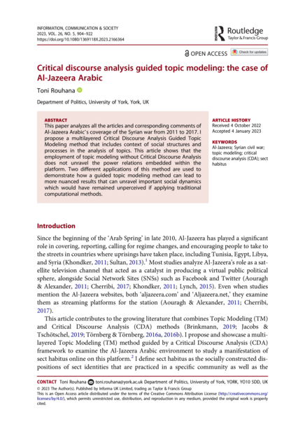 "This paper analyzes all the articles and corresponding comments of Al-Jazeera Arabic’s coverage of the Syrian war from 2011 to 2017. I propose a multilayered Critical Discourse Analysis Guided Topic Modeling method that includes context of social structures and processes in the analysis of topics. This article shows that the employment of topic modeling without Critical Discourse Analysis does not unravel the power relations embedded within the platform. Two different applications of this method are used to demonstrate how a guided topic modeling method can lead to more nuanced results that can unravel important social dynamics which would have remained unperceived if applying traditional computational methods." (Abstract)