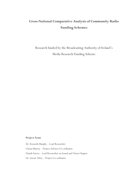 "This research project was undertaken with the purpose of exploring the ways in which government mandated programme production schemes may contribute to the capacities and sustainability of the community radio sector. The study involved a critical policy analysis of the Irish Sound and Vision Scheme as well as an international comparative analysis of funding schemes as organised in five other jurisdictions [...] The five jurisdictions that were selected for comparison were Austria, Canada, Denmark, France and New Zealand. The choice of schemes was shaped by the ‘method of agreement’ principle, which allows for the selection of varied national contexts (political culture and longevity of scheme, etc.) combined with the relative comparative nature of the policy under consideration. It is important to note the structural differences between the funding schemes. In Denmark, France and Canada the schemes were initiated as dedicated community media/radio production funds and legislation and policy evolved accordingly. In Austria the scheme was legislated for and developed as a dedicated community broadcasting production fund alongside a dedicated fund for the commercial broadcasting sector. In New Zealand the scheme was legislated for as a generic ‘local content’ production fund (open to community, commercial and public television and radio broadcasters) and adapted to enable a dedicated funding policy for access/community radio production within the wider scheme. In Ireland the scheme originated from legislation for a ‘national content’ production fund, open to broadcasters (community, commercial and public) and independent producers. The scheme is ‘generic’ and open to all of these sectors and is thus not a dedicated community media scheme, nor does it contain a separate scheme for community media production funding." (Executive summary, pages v-vi)