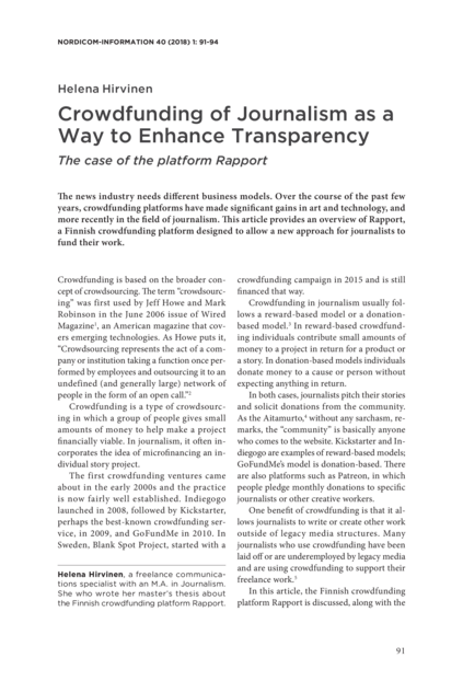 "Over the course of the past few years, crowdfunding platforms have made significant gains in art and technology, and more recently in the field of journalism. This article provides an overview of Rapport, a Finnish crowdfunding platform designed to allow a new approach for journalists to fund their work." (Page 91)