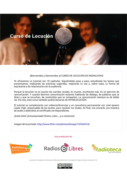 "Te ofrecemos un tutorial con 10 capítulos. Siguiéndolas paso a paso, estudiando los textos que presentamos, realizando las prácticas sugeridas, mejorarás tu voz y, sobre todo, tu forma de expresarte y de relacionarte con la audiencia. Porque la locución no es asunto de cuerdas vocales. Es mucho, muchísimo más. Es un ejercicio de comunicación. Y cuando decimos comunicación estamos hablando de diálogo, de palabras que se dicen y que se escuchan, de contenidos que se comparten. La comunicación siempre es de doble vía. Por eso, este curso también podría llamarse de interlocución. El tutorial se complementa con videoconferencias y un consultorio permanente con José Ignacio López Vigil, responsable de los textos, para resolver tus dudas. Al final, nos enviarás una muestra de audio y obtendrás el certificado correspondiente.