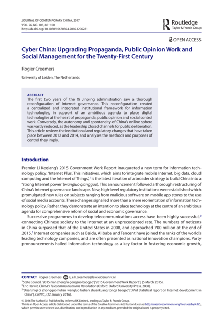 Cyber China: Upgrading Propaganda, Public Opinion Work and Social Management for the Twenty-First Century