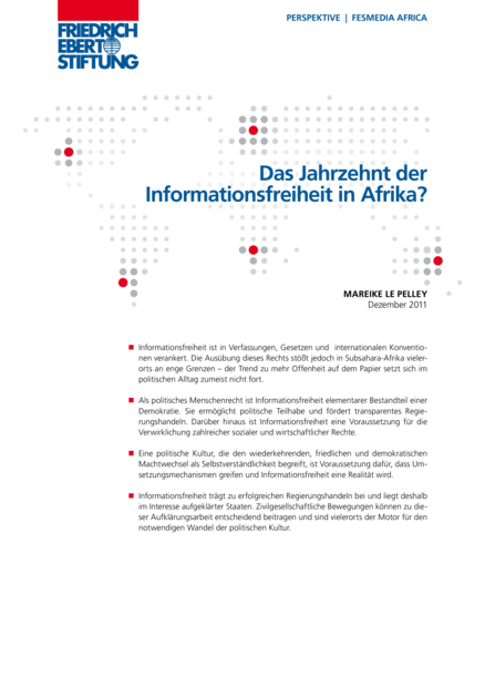 "Informationsfreiheit ist in Verfassungen, Gesetzen und internationalen Konventionen verankert. Die Ausübung dieses Rechts stößt jedoch in Subsahara-Afrika vielerorts an enge Grenzen – der Trend zu mehr Offenheit auf dem Papier setzt sich im politischen Alltag zumeist nicht fort. Als politisches Menschenrecht ist Informationsfreiheit elementarer Bestandteil einer Demokratie. Sie ermöglicht politische Teilhabe und fördert transparentes Regierungshandeln. Darüber hinaus ist Informationsfreiheit eine Voraussetzung für die Verwirklichung zahlreicher sozialer und wirtschaftlicher Rechte. Eine politische Kultur, die den wiederkehrenden, friedlichen und demokratischen Machtwechsel als Selbstverständlichkeit begreift, ist Voraussetzung dafür, dass Umsetzungsmechanismen greifen und Informationsfreiheit eine Realität wird." (Seite 1)
