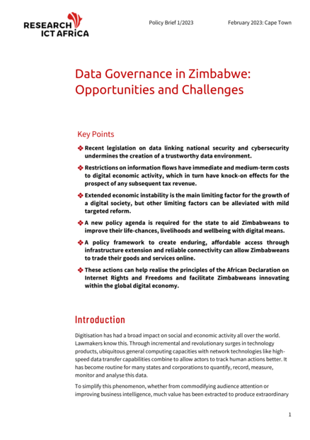 "Recent legislation on data linking national security and cybersecurity undermines the creation of a trustworthy data environment. Restrictions on information flows have immediate and medium-term costs to digital economic activity, which in turn have knock-on effects for the prospect of any subsequent tax revenue. Extended economic instability is the main limiting factor for the growth of a digital society, but other limiting factors can be alleviated with mild targeted reform. A new policy agenda is required for the state to aid Zimbabweans to improve their life-chances, livelihoods and wellbeing with digital means. A policy framework to create enduring, affordable access through infrastructure extension and reliable connectivity can allow Zimbabweans to trade their goods and services online. These actions can help realise the principles of the African Declaration on Internet Rights and Freedoms and facilitate Zimbabweans innovating within the global digital economy." (Key points)
