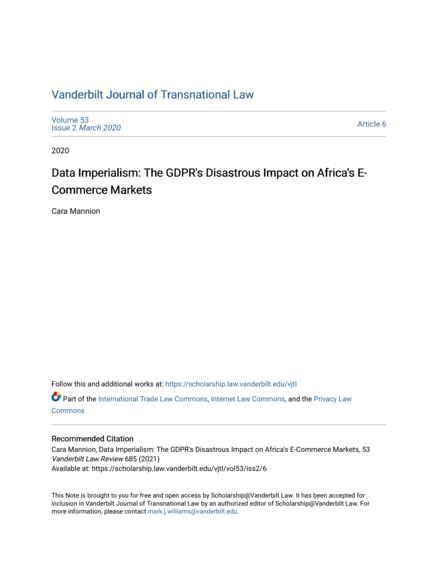 "The European Union (EU) recently passed the General Data Protection Regulation-a sweeping regulatory framework that sets a new global standard for the collection, storage, and use of personal data. To ensure far-reaching compliance with the GDPR, the EU has adopted a strict take-it-or-leave-it approachcountries that wish to engage with digital users in the EU must either comply with the GDPR's expansive data obligations or risk losing access to the world's largest trading block. This presents significant obstacles for several African nations. Notably, no African country currently has domestic laws that comply with the GDPR. Even if they did, several African countries lack stable judicial branches to enforce such laws, and many do not have the technological infrastructures or expertise to ensure ongoing compliance. Additionally, the GDPR's extraterritoriale ffects may amount to data imperialism, allowing the EU to impose its own definition of data privacy on African countries without concern for their unique social values and economic realities. This Note analyzes how the GDPR negatively impacts several African countries, as well as the difficulties in solving these economic and social problems. Although there are no easy solutions for these complex issues, this Note recommends that African countries adopt data privacy legislation at the regional level, create regional enforcement authorities, and invest in technological infrastructure and training." (Abstract)
