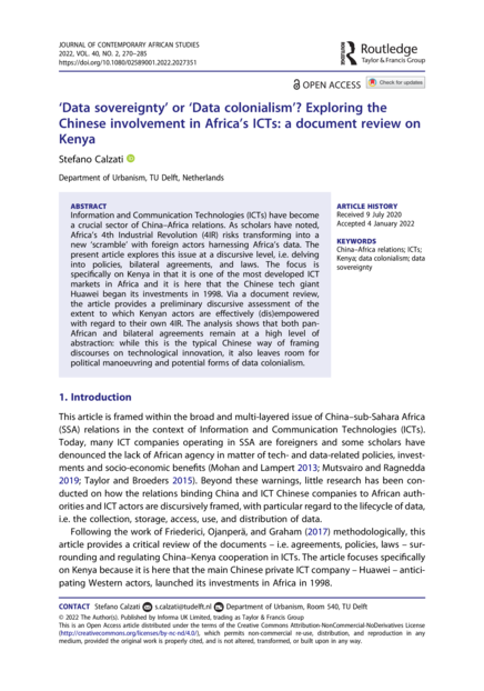 "Information and Communication Technologies (ICTs) have become a crucial sector of China–Africa relations. As scholars have noted, Africa’s 4th Industrial Revolution (4IR) risks transforming into a new ‘scramble’ with foreign actors harnessing Africa’s data. The present article explores this issue at a discursive level, i.e. delving into policies, bilateral agreements, and laws. The focus is specifically on Kenya in that it is one of the most developed ICT markets in Africa and it is here that the Chinese tech giant Huawei began its investments in 1998. Via a document review, the article provides a preliminary discursive assessment of the extent to which Kenyan actors are effectively (dis)empowered with regard to their own 4IR. The analysis shows that both pan-African and bilateral agreements remain at a high level of abstraction: while this is the typical Chinese way of framing discourses on technological innovation, it also leaves room for political manoeuvring and potential forms of data colonialism." (Abstract)
